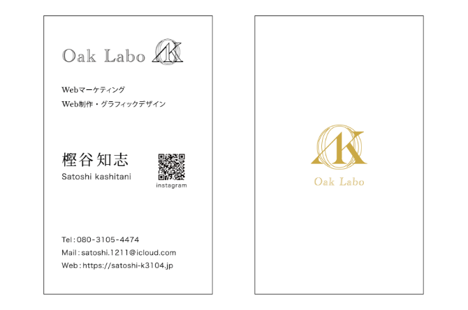 モノクロでシンプルにデザインしました。名前は苗字を参考にし、裏のロゴは箔押しでカラーは金を使用しワンポイントを出しました。