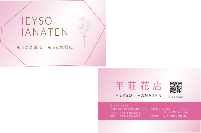 平荘花店さんのイメージと結びつくよう作成しました。来店していただいた方がお店のWebサイト見れるよう裏にQRコードを入れました。